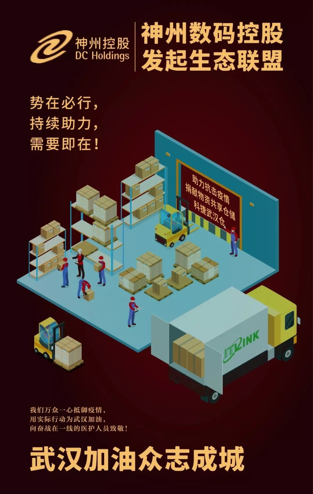 神州控股自1月26日宣布发起生态联盟持续助力抗击疫情后,获得众多生态伙伴的积极响应,捐赠物资正在源源不断抵达武汉,神州控股员工又度过了奋战无眠的24小时,为这些生态合作伙伴企业捐赠武汉医院机构的紧急医疗物资与设备,提供免费仓储服务。