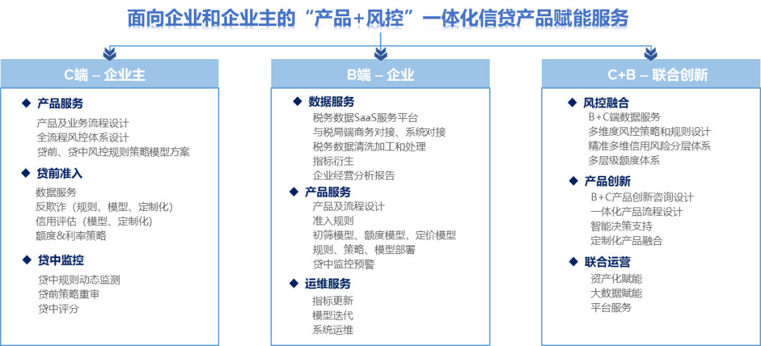 “产品+风控”的双效赋能综合解决方案既可以为“C端”信贷产品赋能,又可以为“B端”信贷产品赋能。此外,还可以打造“B+C”叠加的赋能服务方案,包括风控融合、产品创新、联合运营的服务模块。